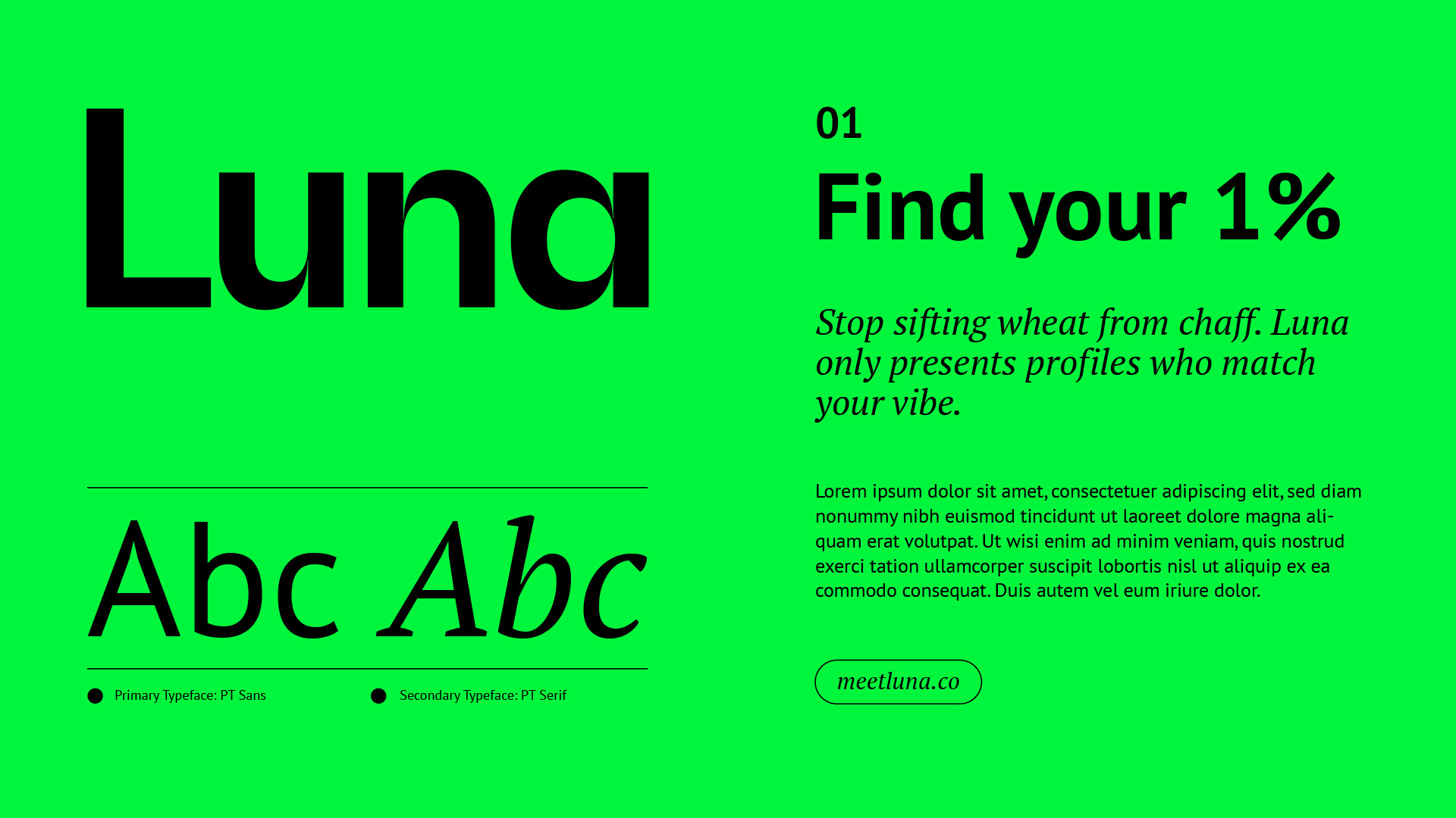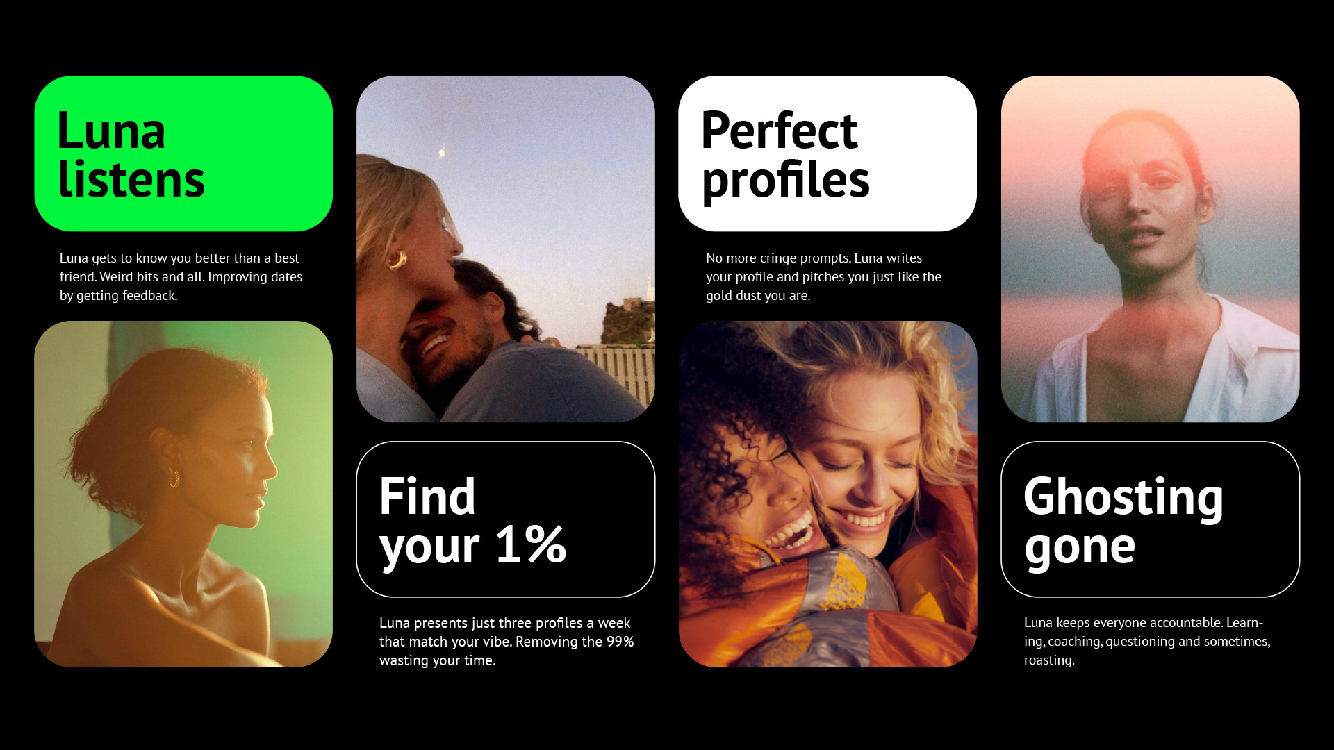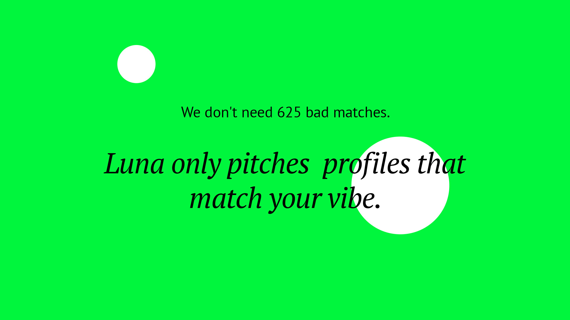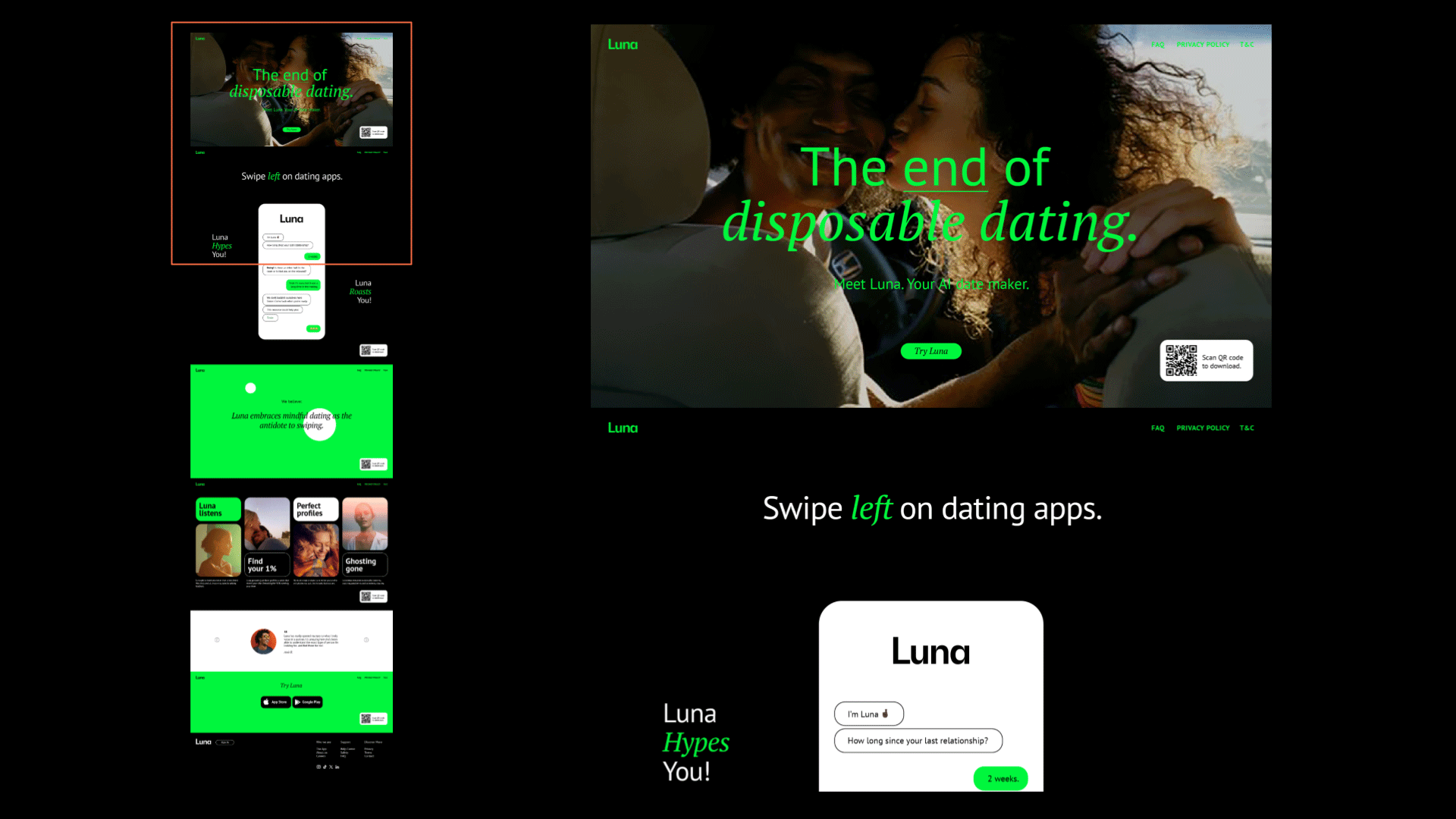 Luna is an AI-driven dating app aiming to redefine the matchmaking experience by prioritizing meaningful connections and user accountability. Tasked with developing Luna's brand identity, I led the creative direction and design execution, crafting a visual language that reflects the app's bold and playful personality. This involved creating a distinctive brand look, vibrant color palette, and engaging UI elements that set Luna apart in a crowded category. —